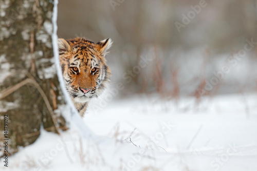 Hidden Portrait Of Wild Cat Siberian Tiger In Snow Fall