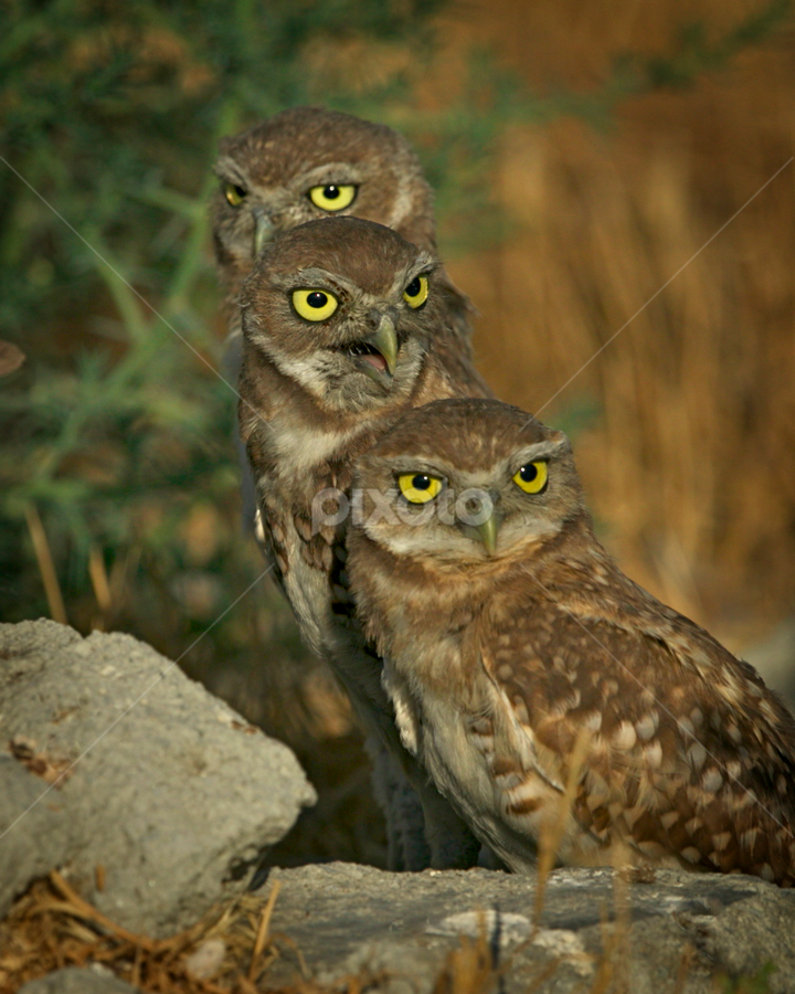 Juvenile Burrowing Owl Triplets See No Evil Hear No Evil