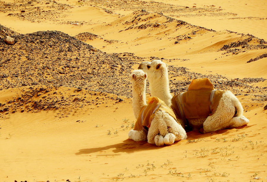Baby Camel Calf And Mother Resting On Sand Beautiful Yellow