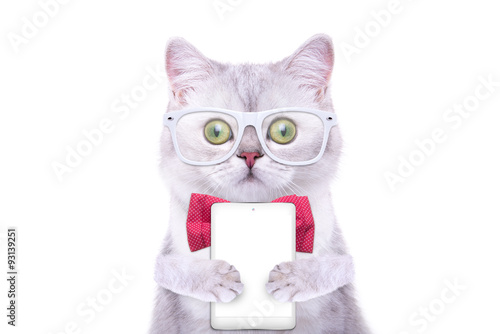Smart Beautiful British Cat With A Tablet Funny Animals