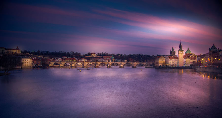 Architecture Building City Cityscape Capital River Tower Bridge Old Building Prague Czech Republic Charles Bridge Evening Lights Clouds Trees Reflection Sculpture Cathedral Church