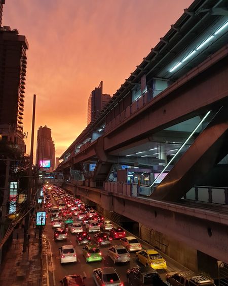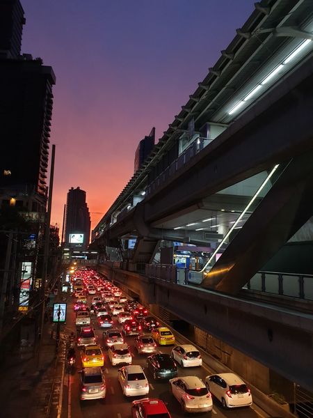 Sunset Over Bangkok City Business Downtown And Train Night