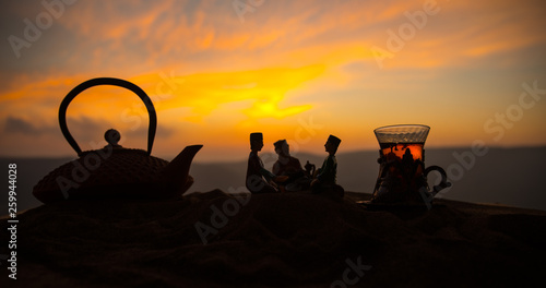 Arabic Tea In Traditional Glass And Pot On Desert At Sunset