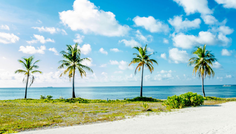 Beach Sand Sea Palm Trees Clouds Water Nature