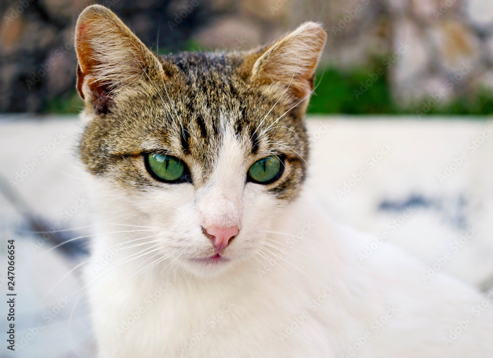 Pretty Gray And White Cat With Bright Green Eyes