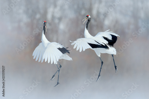 Dancing Pair Of Red Crowned Crane With Open Wings Winter