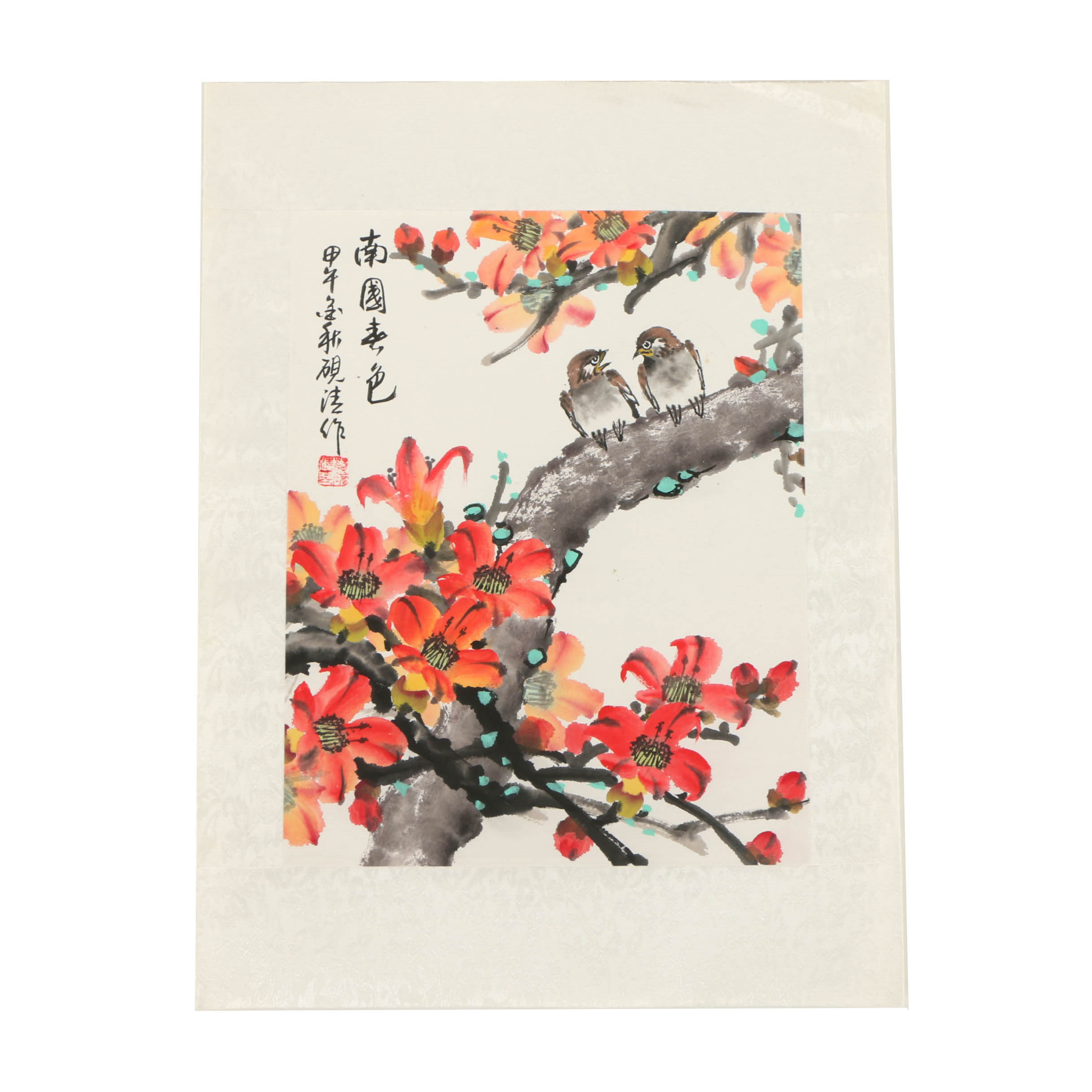 Chinese Ink And Watercolor Painting Of Birds In Flowering Tree