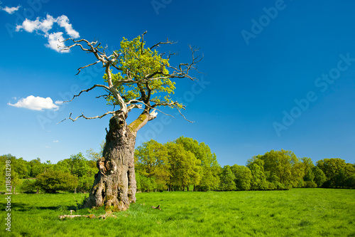 Ruin Of A Mighty Oak Tree On Green Field In Spring Only On