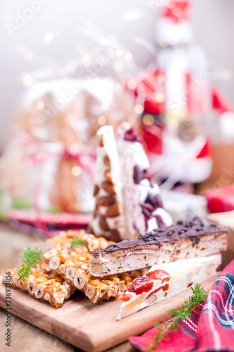 Christmas fruit sweets. Serve as a dessert or a sweet and decadent breakfast. A luscious sauce made with orange liqueur makes this dish perfect for the holidays. Or toast the new year ahead with chocolate bottles filled with real liqueurs. A delicious assortment of fresh seasonal fruit and hand made christmas treats packed in a wicker basket and tied with a bow for a festive presentation.