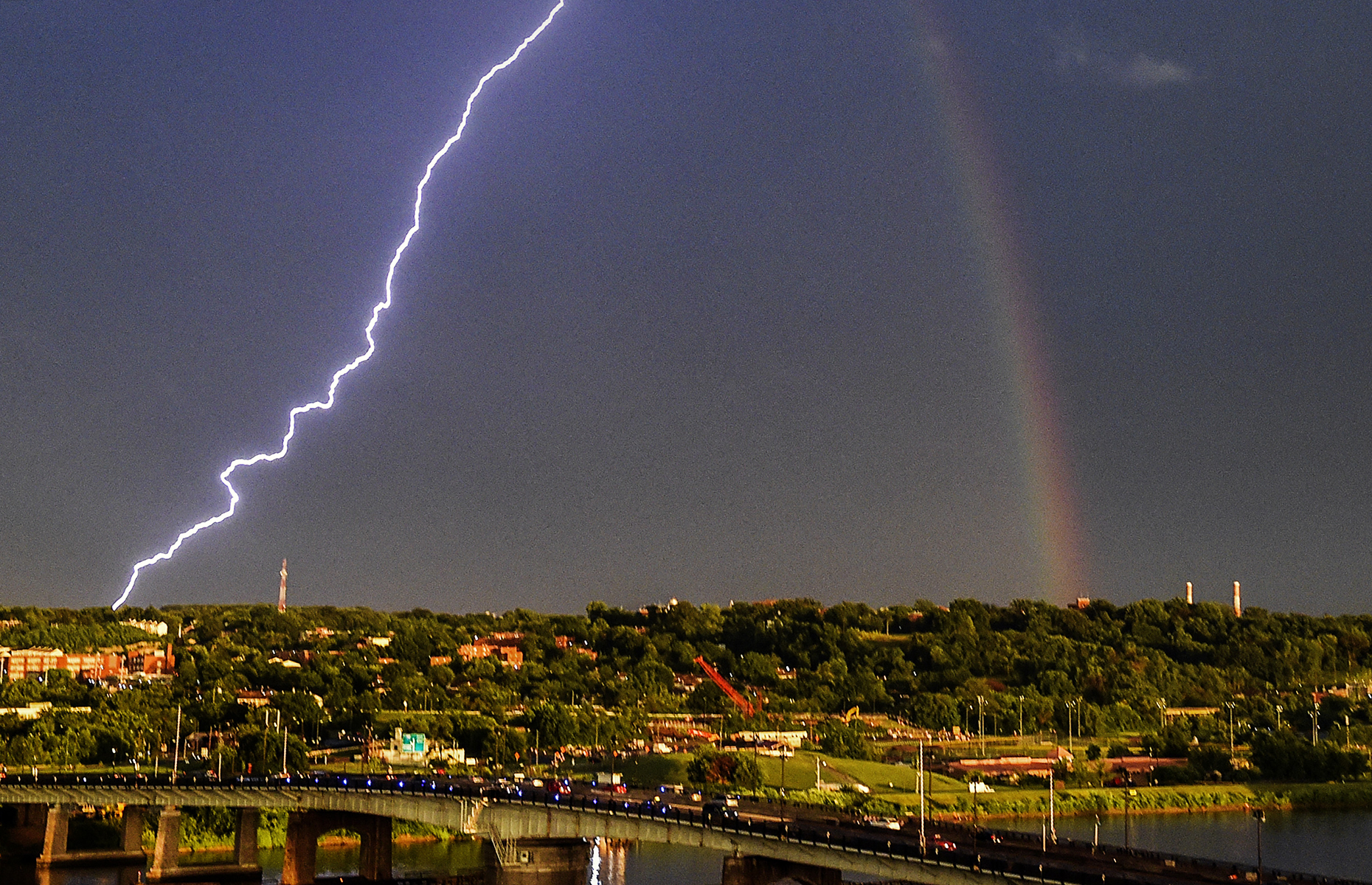 Dark Storm Clouds Over City With Rainbow And Electricity