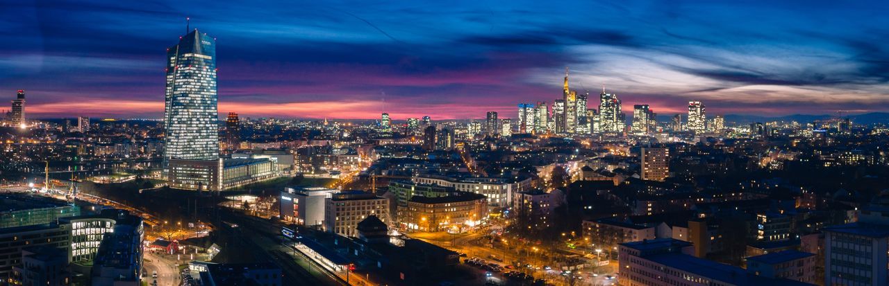 Cityscape Frankfurt Germany Sunset Colorful Lights Sky