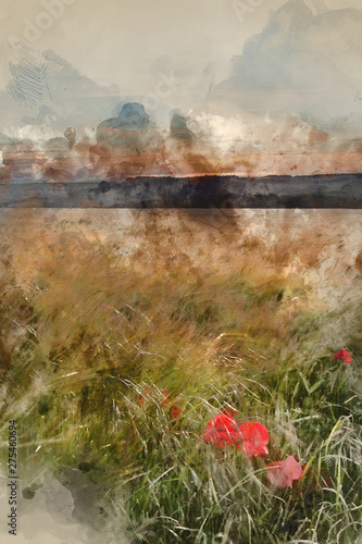 Digital Watercolor Painting Of Poppy Field Landscape In