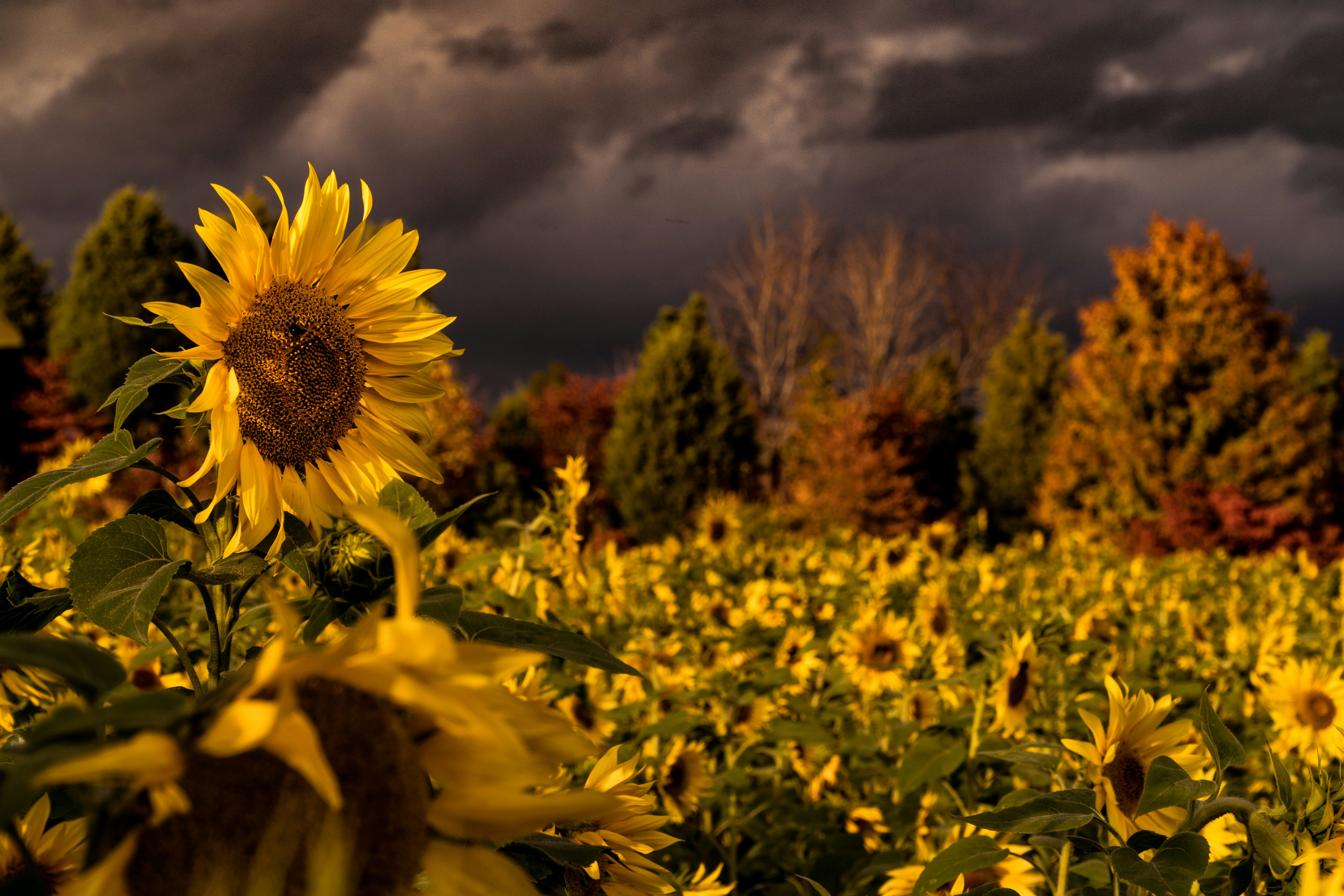 Big Sunflower Garden Dark Sky Evening Plant Leaves Background