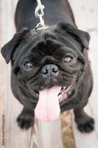 Pug Dog Sits On A Wooden Bench On A Leash The Tongue