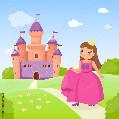 Fairy Tale Princess In Pink Beautiful Dress And Her Cute