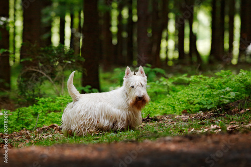 Cute Dog Lost In The Dark Forest White Scottish Terrier