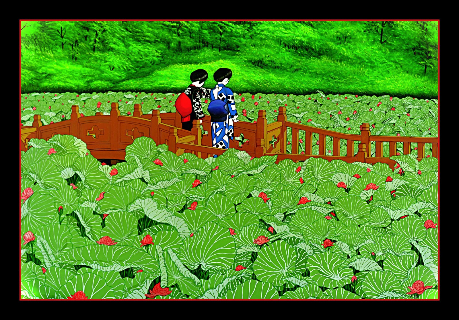 Hanging Bridge Over Red Vehicle And Green Field Painting
