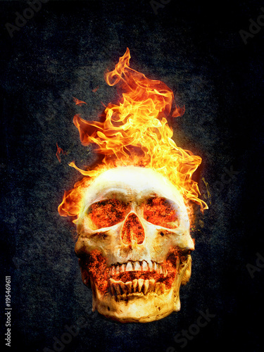 Human Skull Burning With Fire On Abstract Dark Background