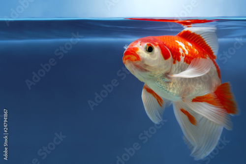 Bright Red And White Aquarium Fish In Fishbowl With