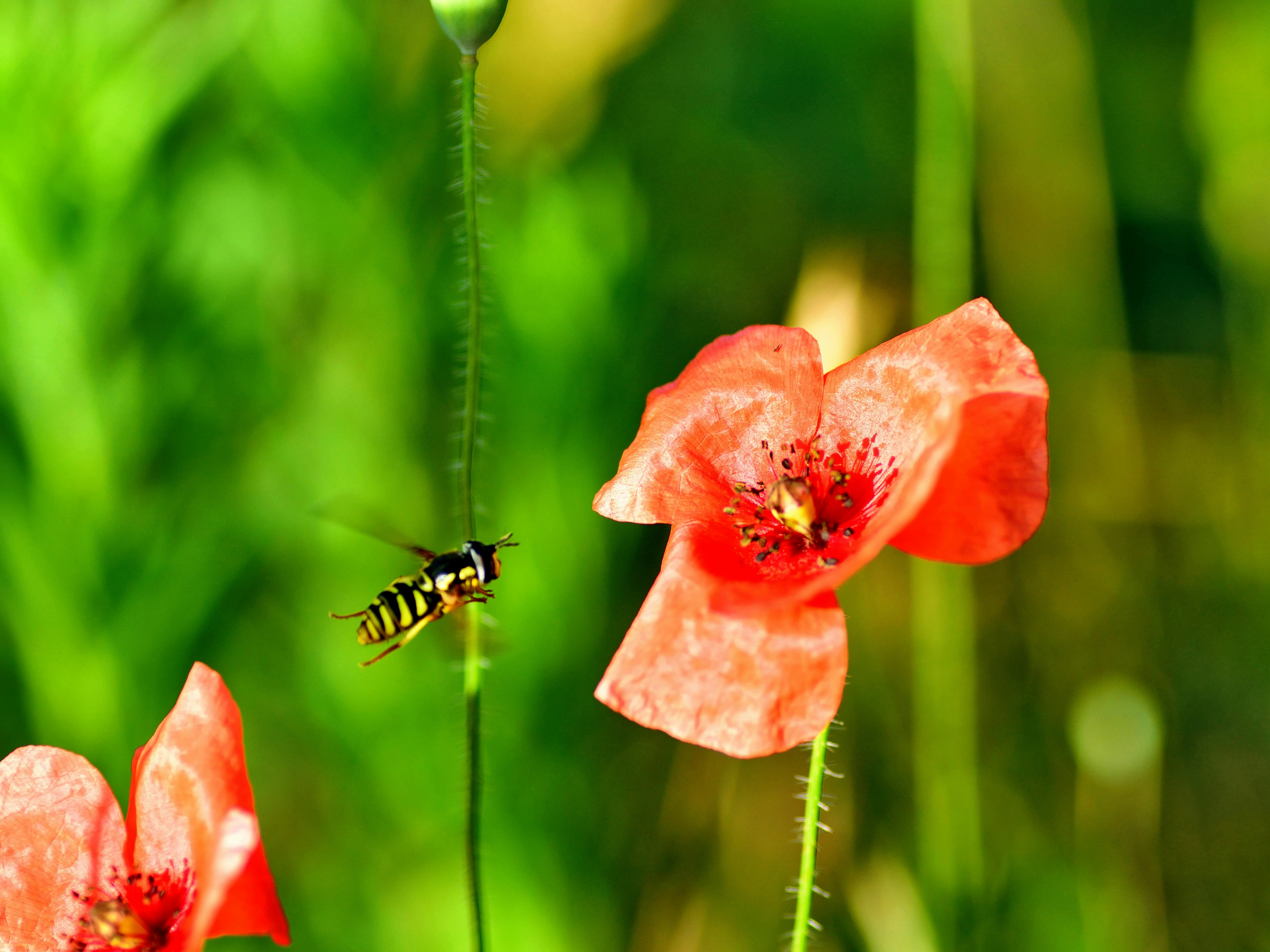 Close Poppy Flower Field Full Out Focus Poppies Bee Flying