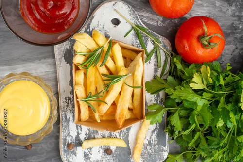 French Fries With Rosemary Sauces And Tomatoes On A Dark