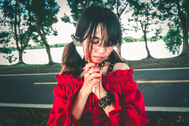 Young Woman In Black Dress And With Bloody Tears Images And