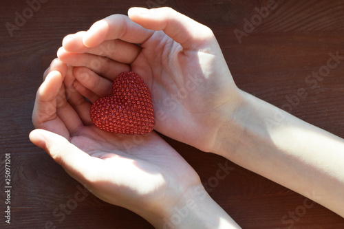 Red Heart In Human Hands On Brown Wooden Background In