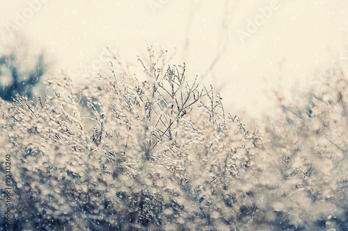 Branches Of Plants Were Frozen With Ice Snowy Winter Landscape