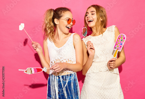 Two Young Stylish Smiling Blond Women Eating Props Sweet Ice