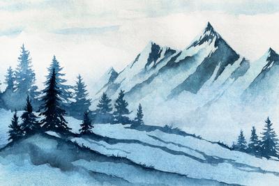 Watercolor Illustration Winter Mountains Landscape Trees Sky Art Print By Alexgreenart Art Com