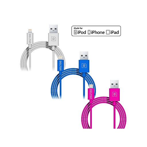 Delton Lightning Usb Cable For Iphone Ipad Ipod Touch Assorted Colors Pack Of 3 Ce14542a