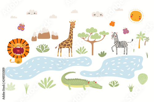 Hand Drawn Vector Illustration Of Cute Animals Lion Zebra