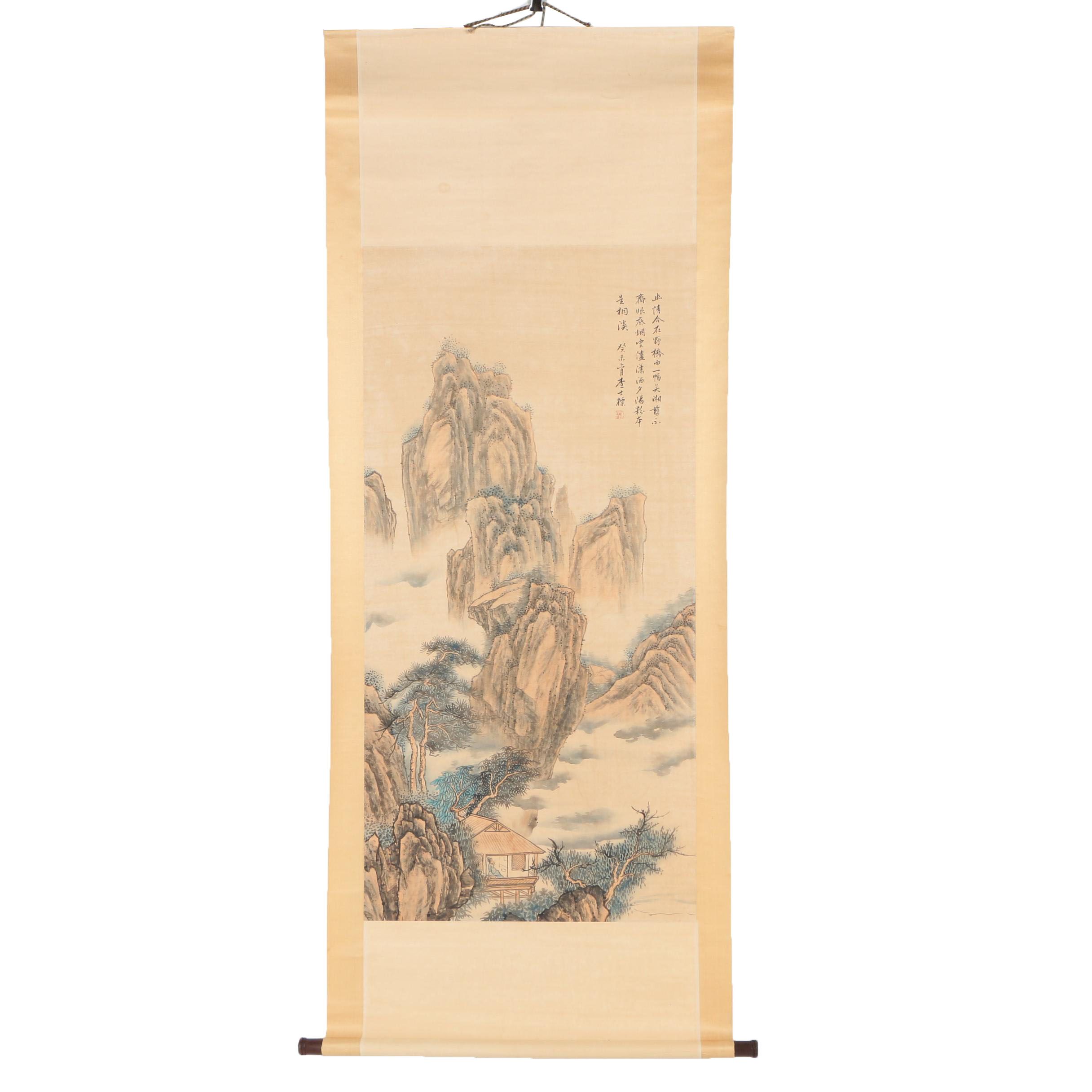 Chinese Ink And Gouache Mountain Landscape Hanging Scroll
