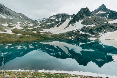 Mountain Lake Water Reflection Landscape With Snowy Peaks