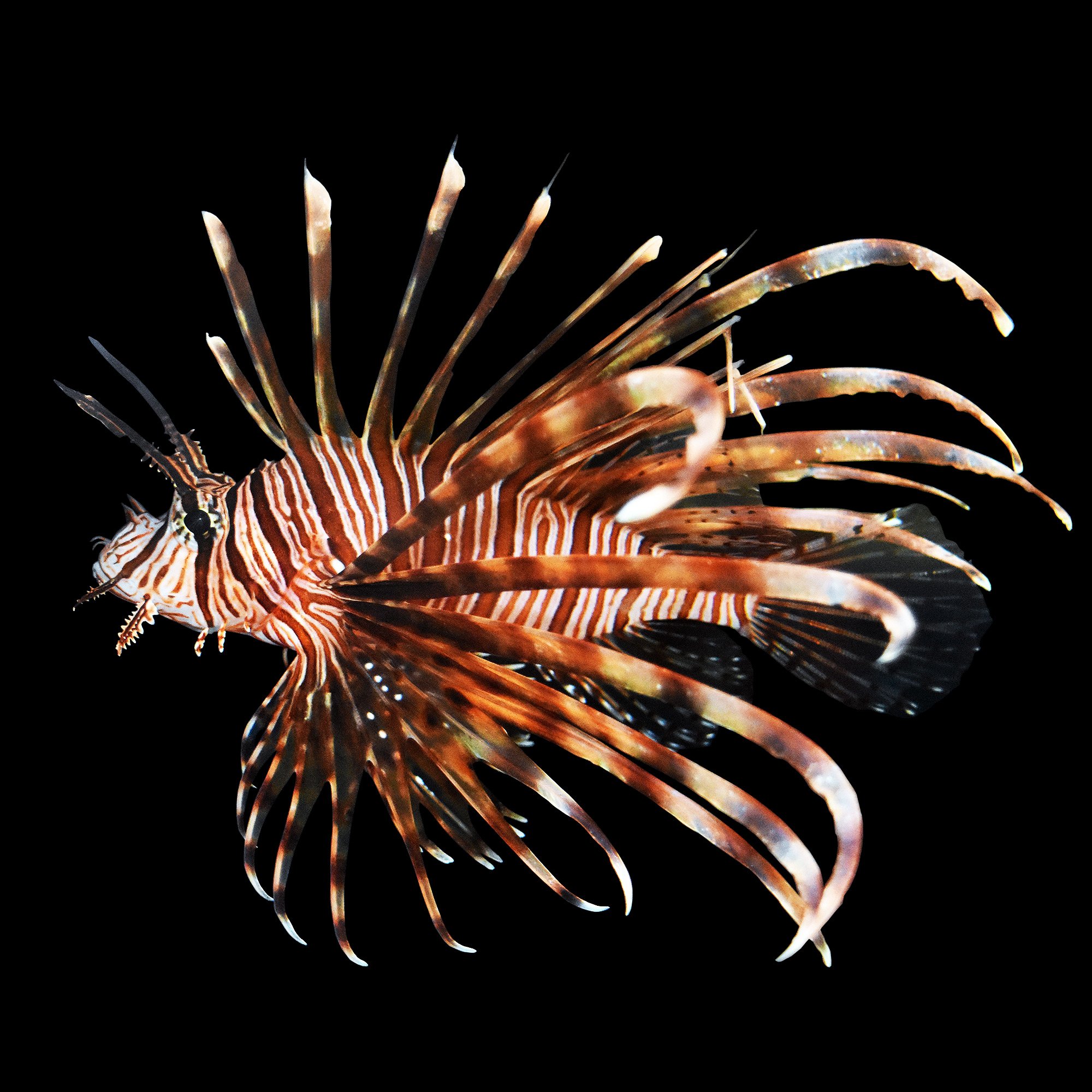 Lionfish animals fishes underwater sea ocean life sand color fins eyes. The fish in fact get their common name from this spectacular camouflage itself as the tentacles and stripe patterns of the fish make it look like the mane of a lion. The red white and black stripes on the lionfish allow them to camouflage suitably into the coral reefs of the indian and the pacific ocean which is the native place of the fish. Like in many scorpionfishes this species has venom filled spines in several of its fins. It gets its common name from its long colorful fin rays that resemble a lions mane.