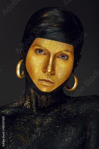 Fashion Art Golden Black Leather Mask Woman Face Portrait