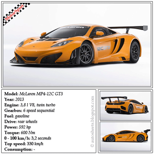 Mclaren mclaren mp4 12c gt3 mclaren mp4 12c 3. 2012 mclaren mp4 12c gt3 sold for 145000 inclusive of applicable buyers fee. Mclaren mp4 12c gt3 top speed information is the most electrifying specification of any sports car. Mclaren mp4 12c gt3 top speed information is the most electrifying specification of any sports car. The mclaren mp4 12c gt3 utilizes the same carbon monocell chassis as the 12c road car along its 38 liter mclaren v8 twin turbo m838t engine albeit detuned to 500.
