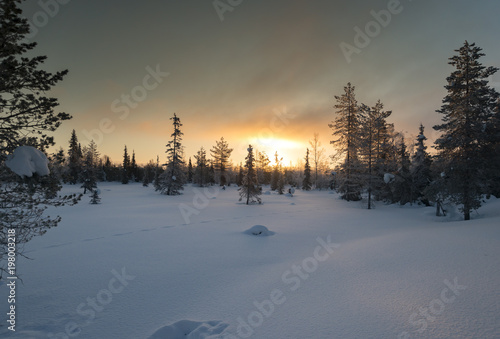 Winter Rural Landscape Forest In The Snow The Sunrise The