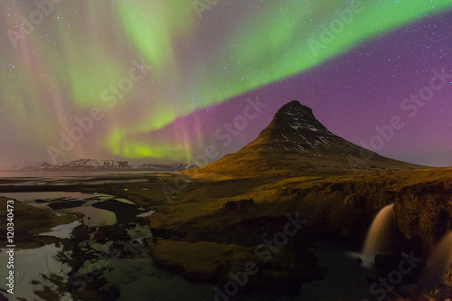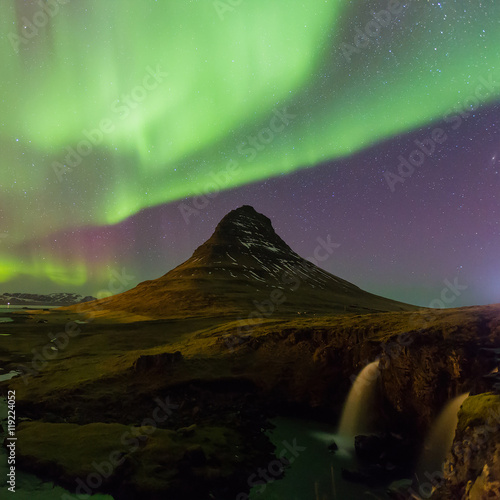 Northern Lights Night View Over Kirkjufell Volcano With