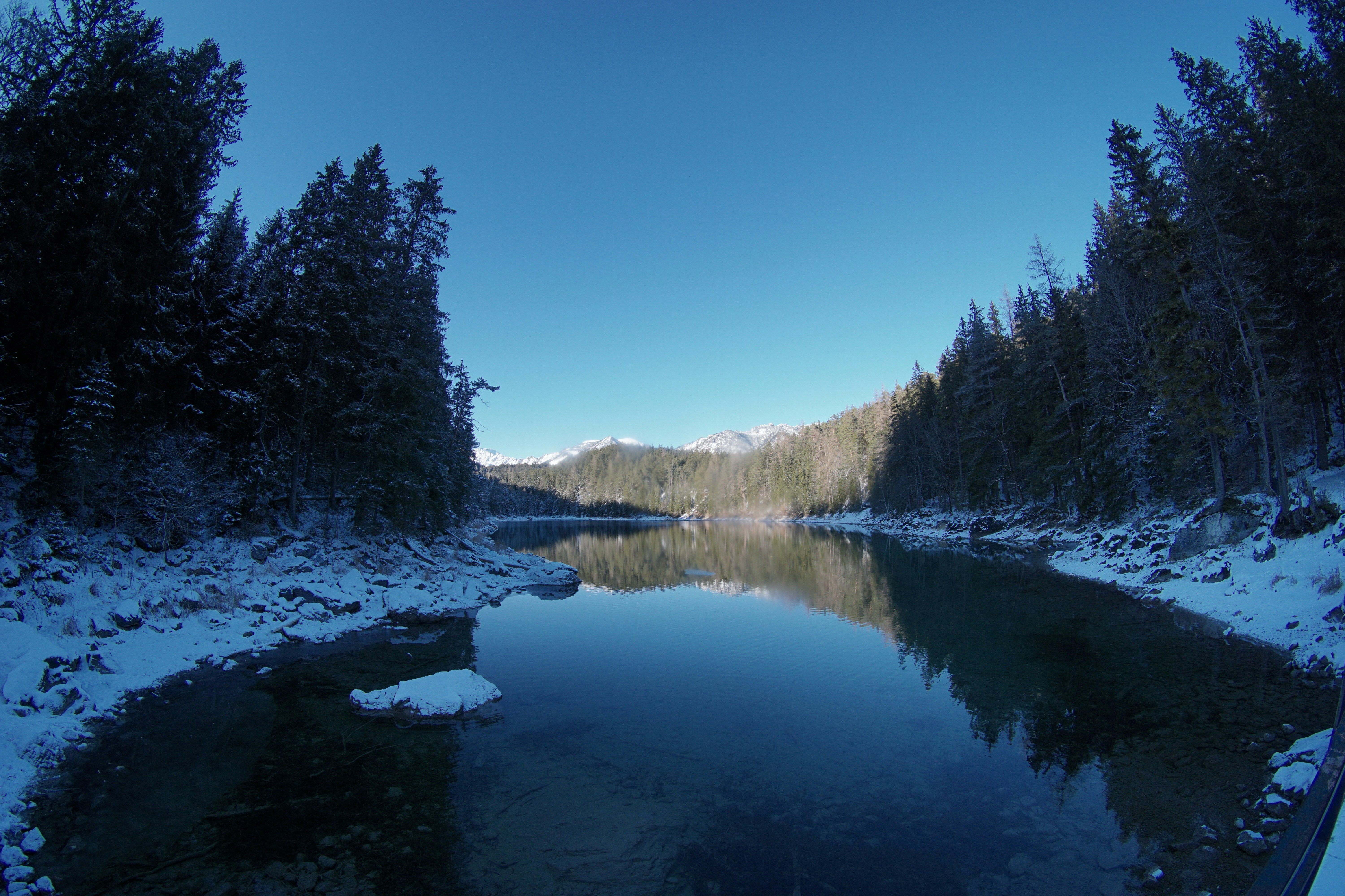 Trees Hoarfrost Lake Colors Dark Blue White Shades