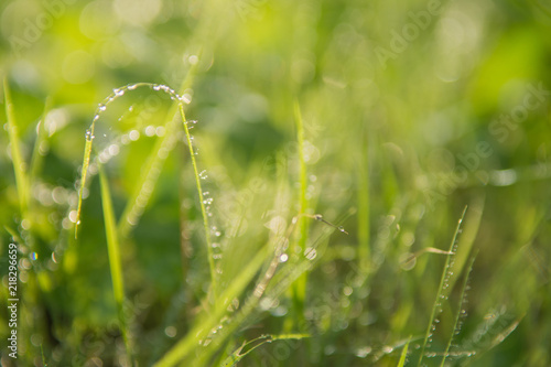 Grass With Dew Drops Blurred Foots Background With Water Drops Closeup Nature