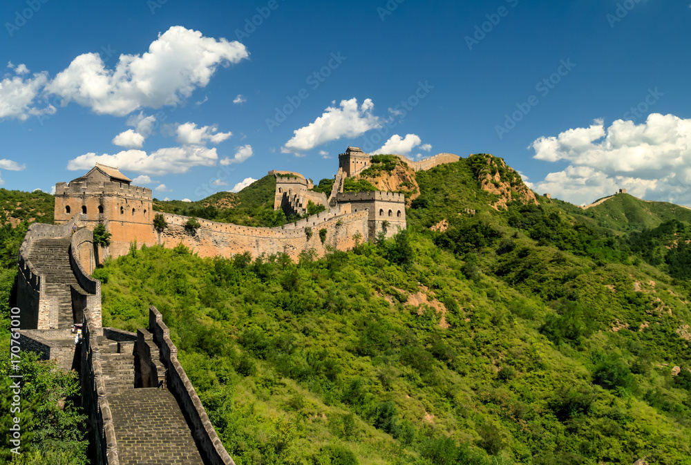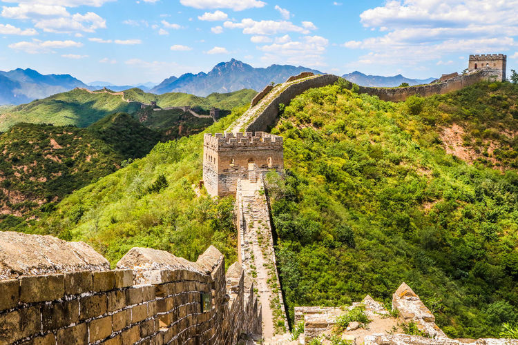 Great Wall Of China On Green Mountain Against Sky Stock