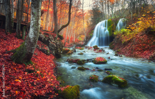 Autumn Forest With Waterfall At Mountain River At Sunset