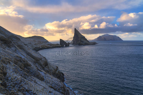 Mykines Island In Sunset With Rocky Cliff On Foreground Faroe