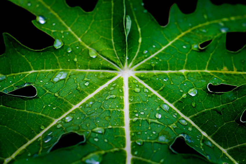 Closeup Green Leaf Water Drops Top View Nature Ecology