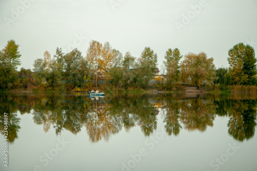 Autumn Landscape Lake Trees And Village By The Lake Calm