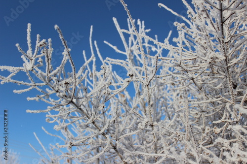Frozen Tree Branches On The Sky Background In The Winter Forest