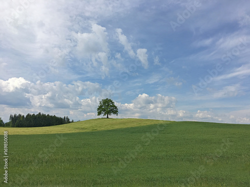 Beautiful Green Meadow With One Tree Under Blue Sky With