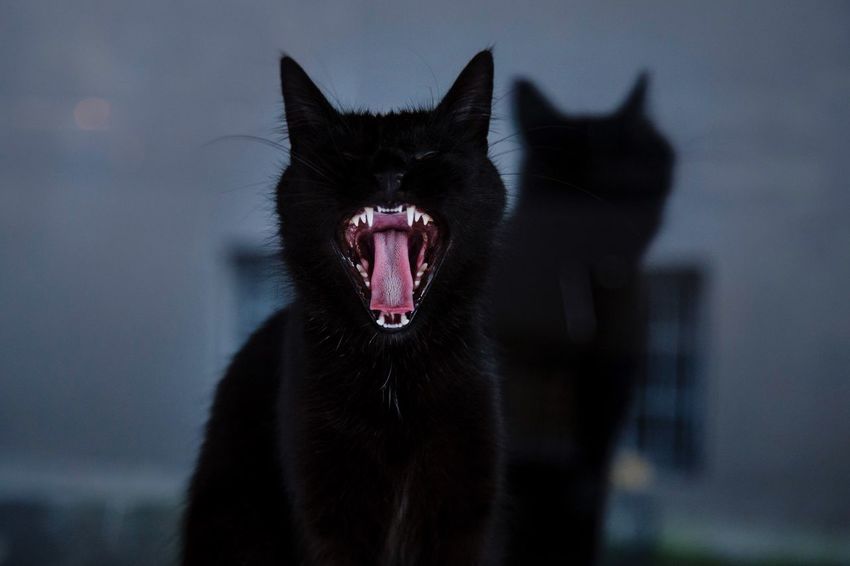 Black Cat Yawning Mouth Wide Open Showing Teeth And Tongue