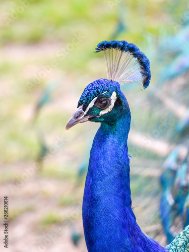 Close Up Photo Of A Colorful Male Peacock Bird Standing In A